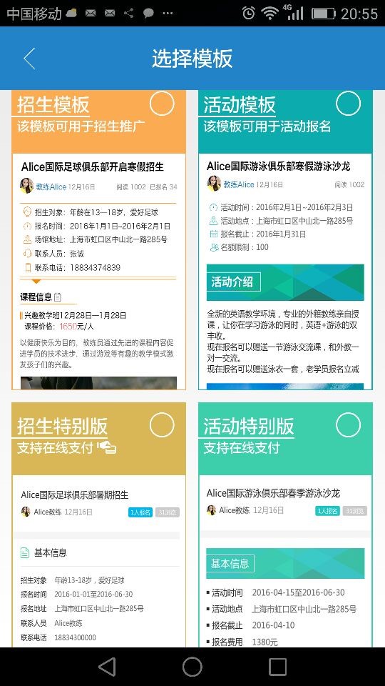 用于发布不同组别培训班,冬、夏令营及赛事活动的信息,能够接受预定,试听报名等功能