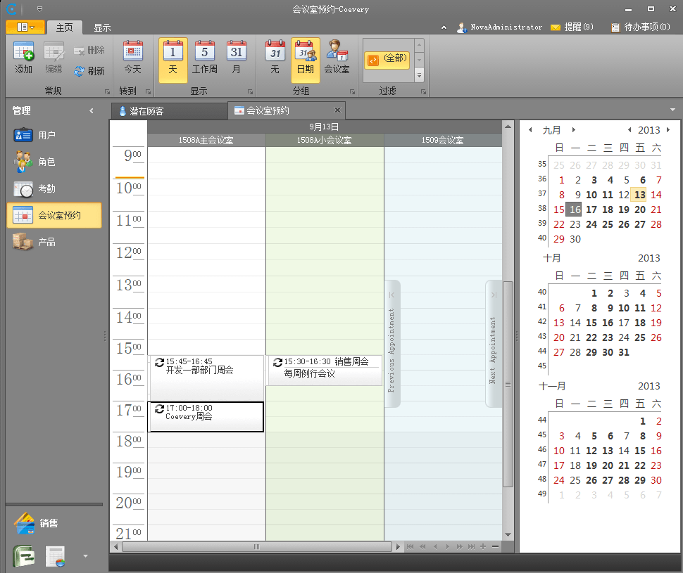会议室预约:通过系统可以预约会议,避免会议室的冲突,如果是例行的会议,只需要在创建的时候将其设置成循环模式,该界面中可以直观看到会议室是否被占用。