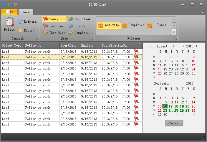 待办事项:潜在顾客和商业机遇提供了后续标识的功能,如果有些记录需要后续跟进,相关人员可以对其添加标识,设定提醒的时间,标识后的记录将作为事件存入到待办事项列表中。在待办事项列表中可修改提醒时间。